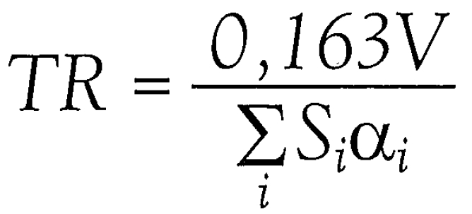 With the reverberation time and volume determined, we can transform the equation to solve for A, the equivalent absorption area, which equals 100% absorption.