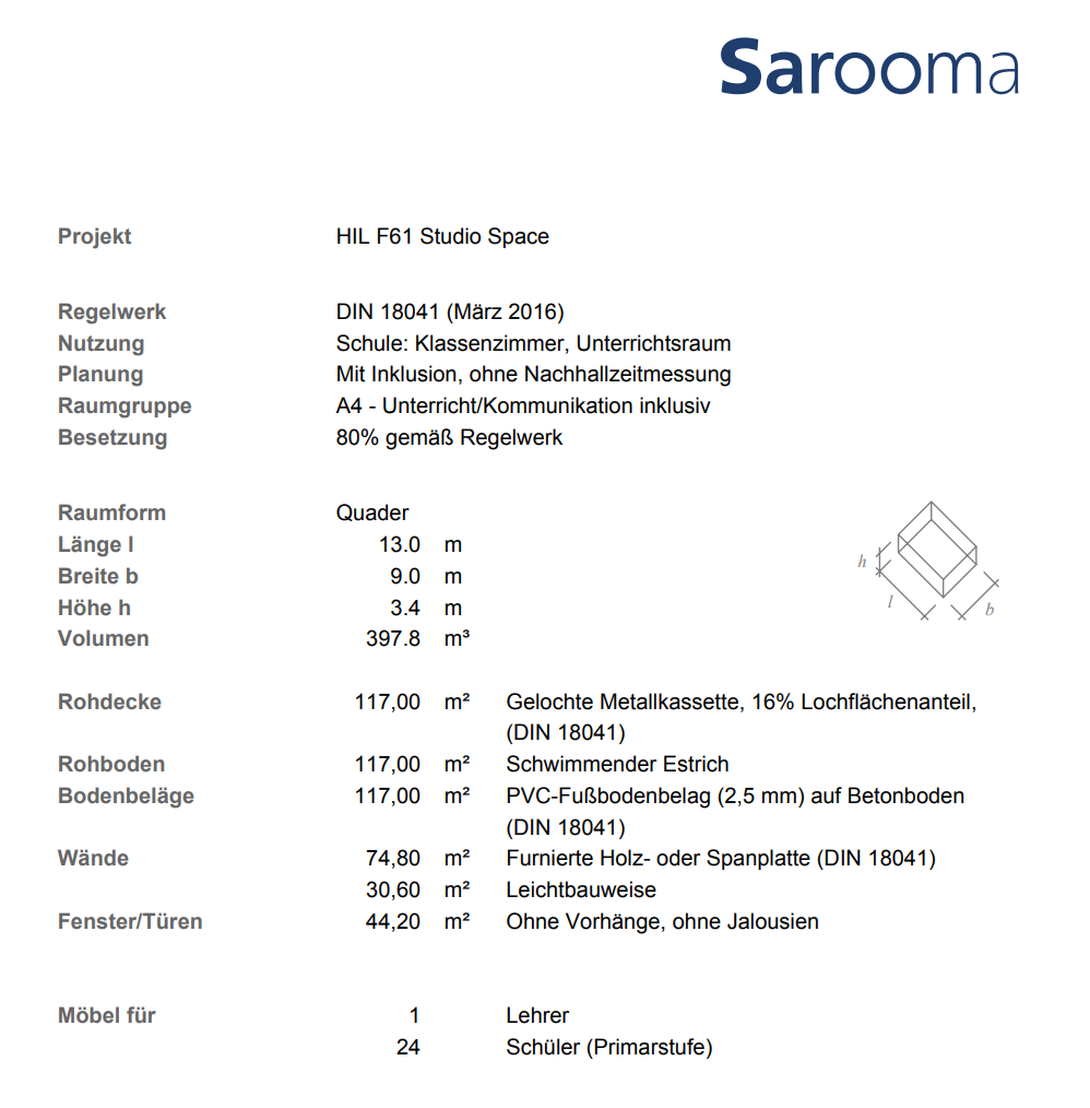 According to SIA 181/1, meeting rooms belong to Type of Use 1C “Communication-intensive uses with multiple simultaneous speakers distributed throughout the room.” Generally speaking, communication involving multiple speakers in this kind of room must be possible, including for people with hearing impairments or foreign-language users. Furthermore for rooms bigger than 500 m³ is this kind of use not suitable. The volume of the room we plan is 636.8 m³, which means in order to transform it into a meeting room the first step I need to do is reducing its effective volume. One way to achieve that is to adjust the height of the suspended ceiling. The exiting ceiling is 4m high. I plan the new ceiling at the height of 3.75m. The corresponding volume is 494.4 m³.